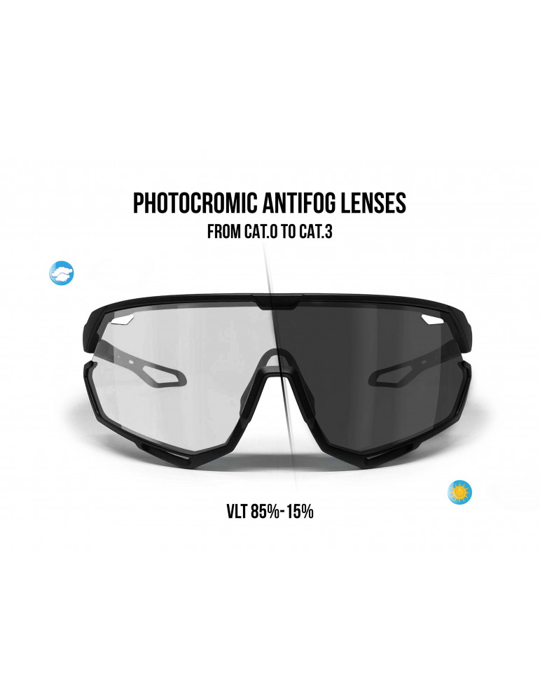 ALPHA is sport sunglasses for cycling, MTB, running, golf, ski and many others. TR90 frame, polymer structure made in Swiss, is extremely lightweight and resistant. Photochromic polarized yellow lens provides exceptional light transmission control with a color adjustment specially designed to maximize contrast and improve visibility. Wider lenses sport sunglasses a larger field of view, windproof and curved design to protect you from air and bad weather. The hyperflow cutting lens avoids condensation increasing airflow and your confortability both in warm and cold days. Ergonomic hydrophilic soft nosepad offers an exceptional fit for any shape of face. Thanks to their excellent grip at arms and nose pads this sunglasses will stay in place.