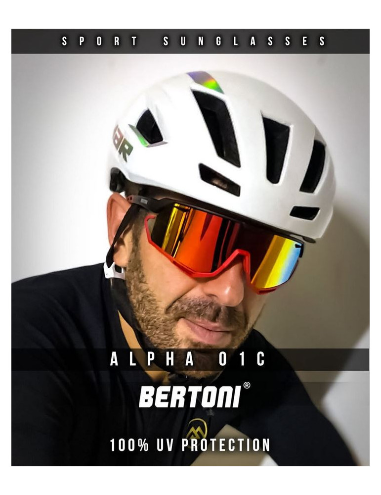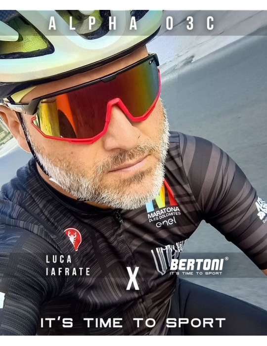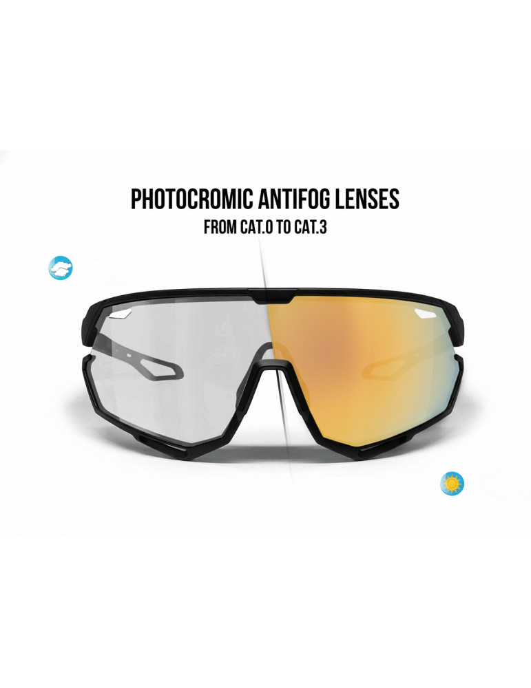 ALPHA is sport sunglasses for cycling, MTB, running, golf, ski and many others. TR90 frame, polymer structure made in Swiss, is extremely lightweight and resistant. Photochromic polarized yellow lens provides exceptional light transmission control with a color adjustment specially designed to maximize contrast and improve visibility. Wider lenses sport sunglasses a larger field of view, windproof and curved design to protect you from air and bad weather. The hyperflow cutting lens avoids condensation increasing airflow and your confortability both in warm and cold days. Ergonomic hydrophilic soft nosepad offers an exceptional fit for any shape of face. Thanks to their excellent grip at arms and nose pads this sunglasses will stay in place.